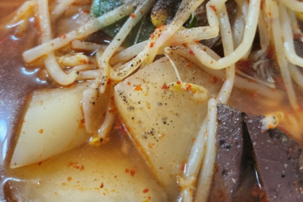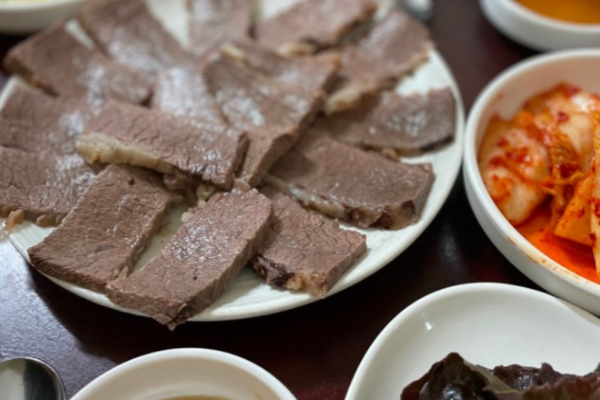 대구식당의 한우국밥은 선지와 돼지고기 수육, 그리고 특유의 고기들이 조화롭게 들어가 풍부한 맛을 자랑합니다. 국밥에는 밥과 국수 면이 함께 들어가 있어, 두 가지 맛을 동시에 즐길 수 있습니다. 깔끔하면서도 깊은 맛을 내는 국물은 큼직한 국내산 한우가 듬뿍 들어 있어 씹는 재미를 더해줍니다. 한우의 부드럽고 야들야들한 식감이 국물과 어우러져 일품입니다.