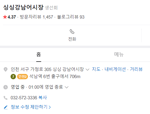 인천광역시 서구 가정로 305에 위치한 싱싱강남어시장은 특히 점심 시간에 많은 사람들이 찾는 맛집입니다. 이곳의 모둠회 정식은 단돈 만 원에 제공되며, 그 푸짐한 구성과 신선한 재료로 많은 사람들의 입맛을 사로잡고 있습니다.