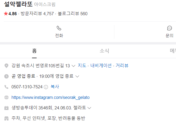 생방송투데이 젤라토 가게 6월3일 촬영지 속초시 번영로 105번길 13에 위치한 '설악젤라또'는 다양한 맛과 쫀득한 식감으로 사랑받는 젤라토 전문점입니다. 이곳은 속초 중앙시장을 방문하기 전