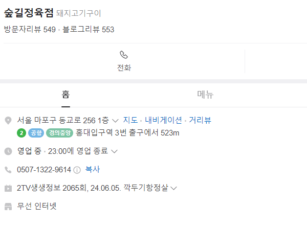 숲길정육점은 매일 오후 1시부터 밤 11시까지 운영되며, 점심부터 늦은 저녁까지 다양한 시간대에 방문할 수 있습니다. 서울 마포구 동교로 256, 1층에 위치한 이 식당은 접근성도 뛰어나 많은 사람들이 쉽게 찾아갈 수 있습니다.