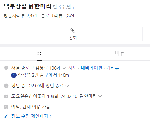 서울 종로구 삼봉로에 위치한 이 맛집은 아늑하고 전통적인 분위기를 자랑하며, 매일 오전 11시부터 오후 10시까지 영업합니다. 백부장집의 대표 메뉴인 닭 한 마리는 2인분 기준으로 28,000원이며, 따뜻한 국물과 부드러운 닭고기의 조화가 일품입니다. 여기에 국수사리를 추가하면 2,000원으로 더욱 푸짐하고 만족스러운 식사를 즐길 수 있습니다.